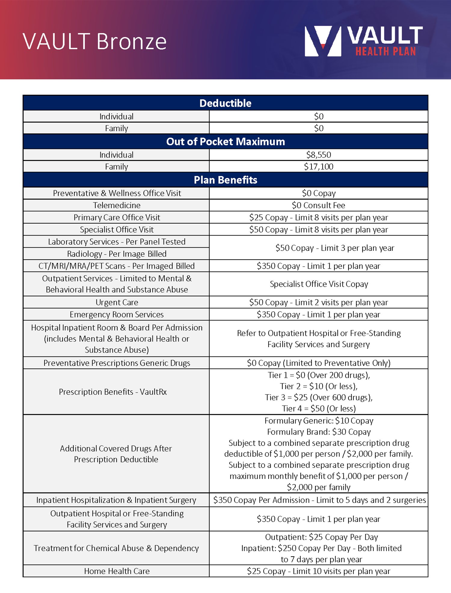 Please Note: Please refer to the Schedule of Benefits and Description of Coverage for the official list of Benefits Coverage, Limitations, and Exclusions. If plan comparison above differs from the Schedule of Benefits and Description of Coverage, the Schedule of Benefits and Description of Coverage will govern.